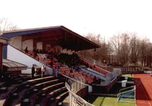 Im Ludwig-Jahn-Stadion erinnern die Bilder ein wenig an das zwei Tage zuvor besuchte Stadion Oberwerth in Koblenz. Zwar kann sich das Publikum in Herford nur auf einer Seite auf Sitzschalen niederlassen, aber auch hier ist eine recht neue Tribüne das Schmuckstück eines ansonsten eher in die Tage gekommenen Grounds. Warum die Sitze jedoch in den Farben des VfB Hüls in Blau-Rot gehalten sind, bleibt wohl das Geheimnis des SC - man wird sie wohl kaum alle zwei Woche passend zum Gast umgestalten, so daß man sich vielleicht besser an das eigene Blau-Weiß-Schwarz gehalten hätte.